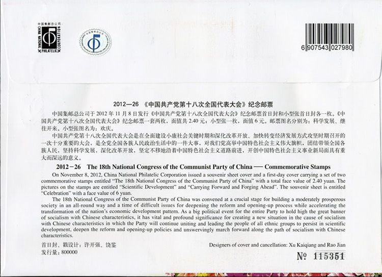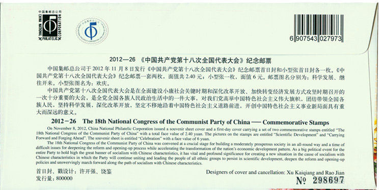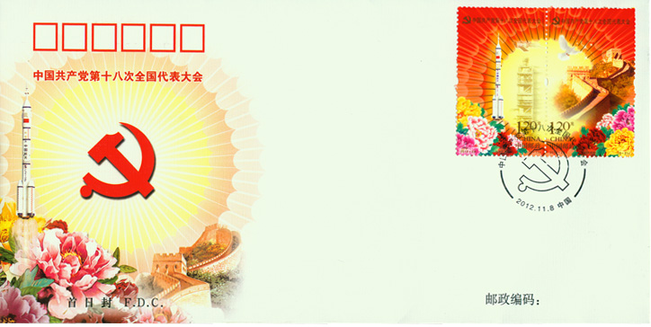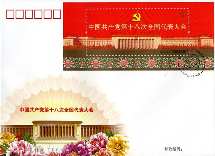 【商品名稱】中國共產黨第十八次全國代表大會 (紀念郵票(一套兩枚)+小型張總公司首日封)