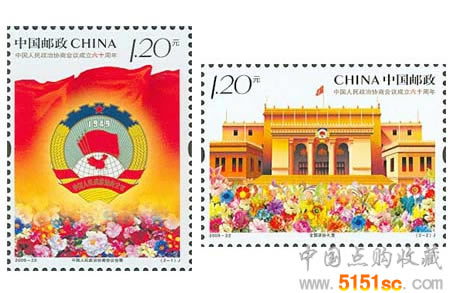 國家郵政局定于2009年9月21日發(fā)行《中國人民政治協(xié)商會議成立六十周年》紀(jì)念郵票1套2枚。
