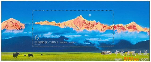 【圖案面值】小型張 日照金山 6元【小型張郵票規格】90×40毫米【小型張外形規格】165×66毫米【小型張齒孔度數】13.5度【版 別】影寫【防偽方式】防偽紙張、防偽油墨、異形齒孔、熒光噴碼【設 計 者】任國恩、尚盈【攝 影 者】李東紅、李志綱、和朝元、齊扎拉【責任編輯】秦巍【印 制 廠】北京郵票廠