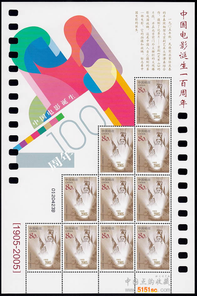 國家郵政局定于2005年8月28日發行《中國電影誕生一百周年》紀念郵票1套1枚。詳情如下: 圖序 圖名 面值 發行量(版式一)