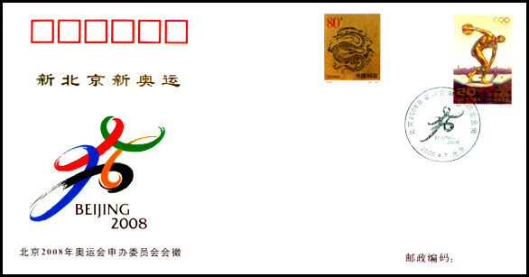 2000年4月7日,是國際奧委會正式接受北京市承辦2008年奧運會申請書一周年紀念日。中國集郵總公司和北京2008年奧運會申辦委員會為此特發行申辦會徽紀念封一枚。申辦會徽由奧運五環色構成,形似中國傳統民間工藝品的“中國結”,又似一個打太極拳的人形,如行云流水,和諧生動,充滿運動感,象征世界人民團結、協作、交流、發展,攜手共創新世紀;表達奧林匹克更快、更高、更強的體育精神。