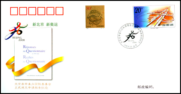 2000年6月20日,北京奧申委向國際奧申委會正式遞交申請報告,回答了國際奧申委會向申請城市提出的22個問題,陳述了關于籌辦2008年奧運會的計劃和構想,是北京市向國際奧申委會遞交的第一份正式答卷。中國集郵總公司和北京2008年奧運會申辦委員會為此特發行紀念封一枚。紀念封圖案內容未申請報告的封面樣式。
