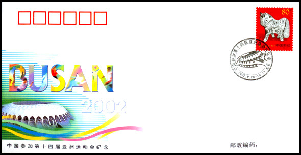 第十四屆亞洲運動會于2002年9月29日至10月14日在韓國釜山舉行。這是亞洲體壇新世紀的首次盛會。本屆亞運會共設正式比賽項目38個大項419個小項。中國派出了近千人組成的代表團,其中運動員686人。這也是我國參加國際綜合性運動會歷史上規模最大的代表團。為此,中國集郵總公司特發行紀念封一枚。