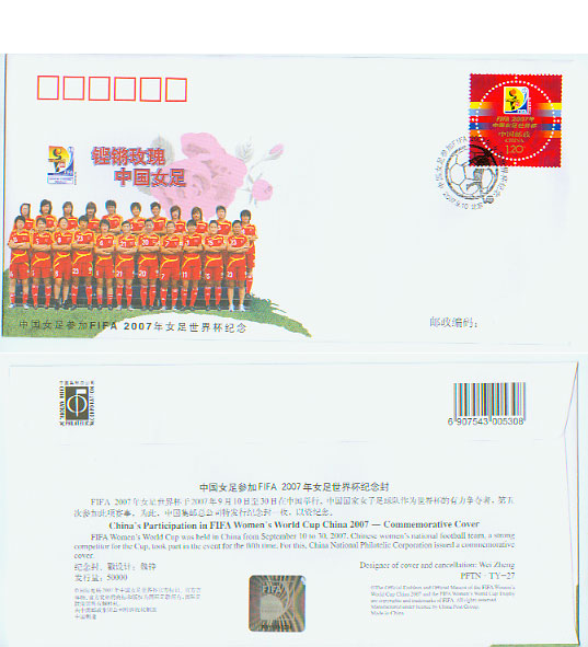 2007年女足世界杯于2007年9月10日至30日在中國舉行。中國國家女子足球隊作為世界杯的有力爭奪者,第五次參加此項賽事。為此中國集郵總公司特發行紀念封一枚,以資紀念。