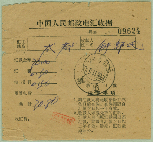 【實拍】1968年11月5日中國人民郵政電匯收據