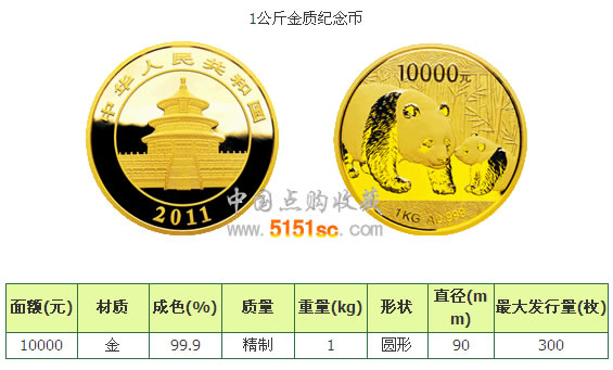 1公斤圓形金質紀念幣為精制幣,含純金1公斤,直徑90毫米,面額10000元,成色99.9%,最大發行量300枚。