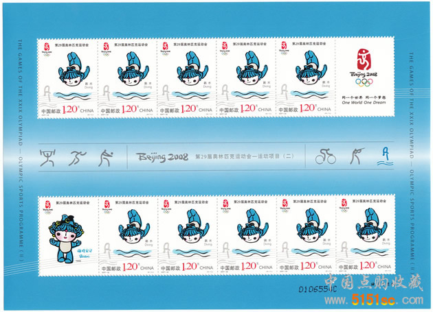 【商品單位】 枚 【全 套 數】 6 枚 【整 張 數】 20 枚 (版式1)/12枚(版式2) 【發行日期】 2007-8-8 【 規 格 】 36*36mm 【齒孔度數】 13.5*13度 【設 計 者】 馬剛 【 版 別 】 影寫 【印 刷 廠】 北京郵票廠