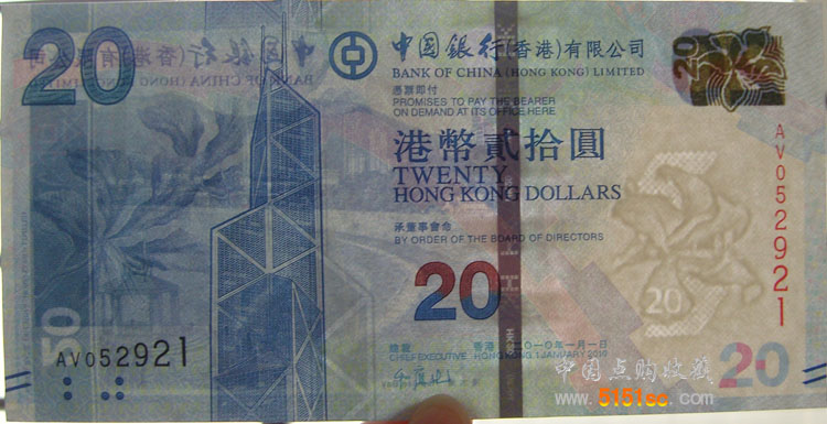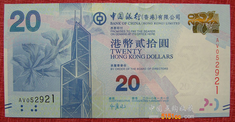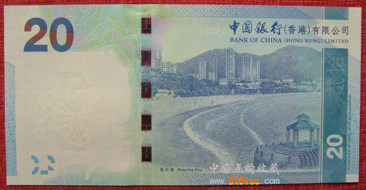20元的票面特征:主色調為藍色,票幅長144mm,寬72mm。票面正面主景為1999年建成的位于中區花園道1號的現為香港第5高大廈的“中銀大廈”外景,背面主景為“凌霄閣”圖案。其主題為“凌霄遠眺”。作為香港地標之一的凌霄閣,造型別致,飛臨港島太平山巔,盡覽香江美景,是萬千中外游客觀光必游之地,呈現出香港旅游事業日益興旺發達的景象。