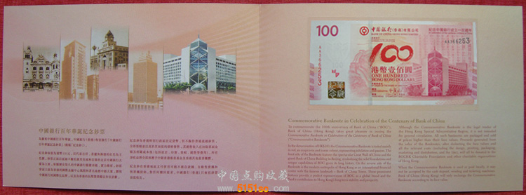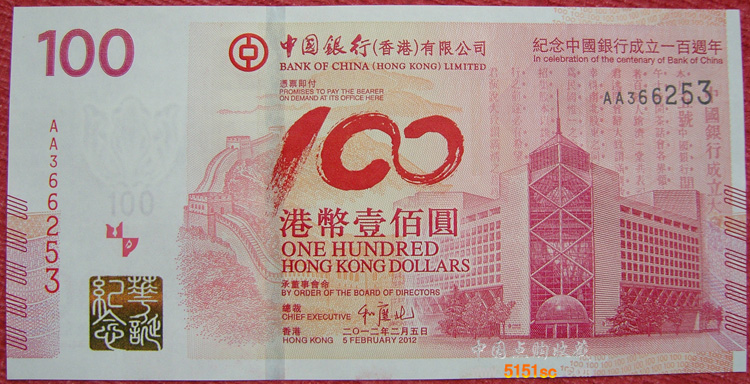 港幣紀念鈔正面主景為中國銀行大廈,襯景為長城和1912年《申報》關于中國銀行成立報道的組合圖案。紀念文字為“紀念中國銀行成立一百周年”。正面中部極具中國書法韻味的數字“100”既是面額,又與百年紀念主題呼應。