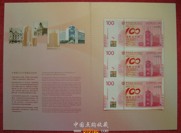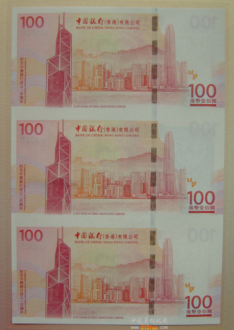 中國銀行100周年紀念鈔三連體(香港),紀念鈔面值為港幣300元,寓意吉祥、喜慶和激情的紅色為主色調。鈔票正面以纏綿不斷的萬里長城和宏偉的北京中國銀行大廈為主景,展現歷史悠久的中國銀行穩健卓越、實力雄厚。鈔票背面主景為香港的國際金融中心風貌和著名的地表中銀大廈。展現中國銀行的國際化形象,以及為香港的長期繁榮穩定作出貢獻,紀念鈔圖案簡潔,色調柔和,雕工細致,極具珍藏價值。