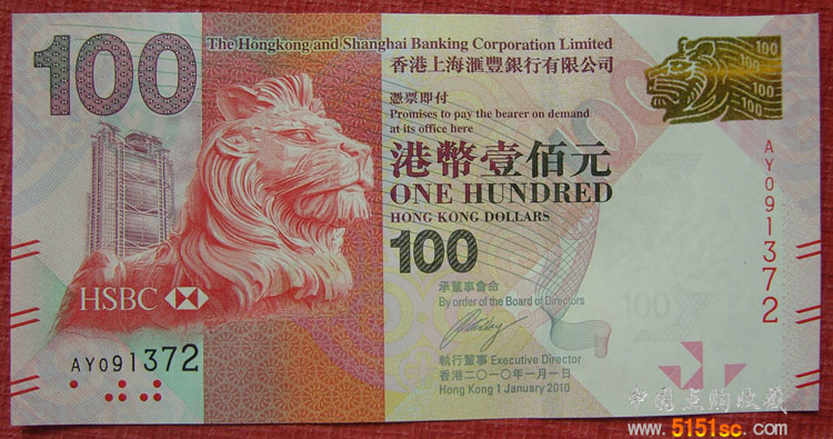 正面:以匯豐獅子“施迪”作主體,背景為亞太區(qū)匯豐總行大廈;