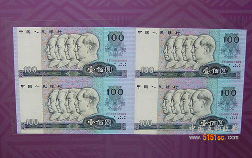 【藏品內容】人民幣紙幣全部9種券別,14種版別的四方聯連體鈔裝幀而成,即100元(80版,90版)、50元(80版,90版)、10元、5元、2元(80版,90版)、1元(80版,90版,96版)5角、2角、1角。