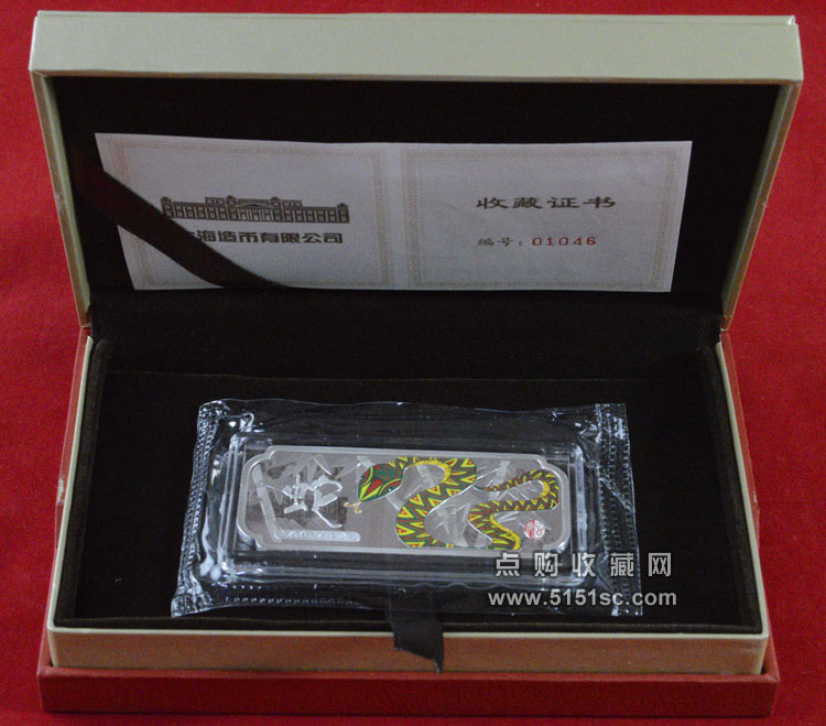 龍去神威在,蛇來紫氣生,蛇主水,善財,因口吐蓮花,身披祥紋,自古便被百姓認為是招財納福、趨吉辟邪的靈獸。作為華夏民族最早的圖騰文化,蛇代表睿智、冷靜,是權勢、智慧、長壽與財富的象征。 蛇年是華夏民族最古老的圖騰文化之一,它代表著睿智、冷靜,是權勢、智慧、長壽與財富的象征,于十二地支中位列第六,遂稱巳蛇。歲在癸巳,蟒蛇降幅,“福祿壽喜財”,蛇年賀歲金銀條,五彩騰蛇昂首吐信守護于富貴牡丹、吉祥如意、福壽蟠桃、延熹春梅和聚寶琉璃壇邊,寓意癸巳豐年大吉、五福同享,為突出“福祿壽喜財”主題,蝙蝠、鹿、仙鶴、喜鵲、金蟾等吉祥元素的運用,更加彰顯金銀條富貴祥和、五福臨門之氣。古書《韓非子》云:“飛龍乘云,騰蛇乘霧。”龍蛇并稱,龍年去,蛇年來,均大吉大利。中國古代神話里,有很多人首蛇身之神,《列子》記載:“伏羲、女媧蛇身而人面,有大圣之德。” 公元2013年,十二地支輪至第六位,時至癸巳蛇年。因靈蛇口吐蓮花,身披祥紋,自古便被百姓認為是招財納福\趨吉辟邪的靈獸。銀蛇翹首迎春,花開富貴增福。蛇年賀歲單枚銀條以'福'為題,取義花開富貴。身披如意蝙蝠花紋的紫色靈蛇頷首而立,雙目靈動清澈,口銜吉瑞蓮花,盤桓于象征圓滿、富貴的牡丹之間,以景言情,寓意癸巳蛇年洪福齊天。背面“福”結合銀條整體造型雍容典雅、富貴吉祥。美好畫面于方寸間盡顯奢華,寄無限期許與祥瑞祝福。