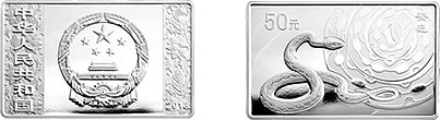 【藏品面額】50(元)【藏品材質】銀【藏品成色】99.9% 【藏品質量】精制【藏品重量】5oz 【藏品形狀】長方形【藏品直徑】80mm×50mm【最大發行量】20000枚 【正面圖案】 中華人民共和國國徽襯以連年有余吉祥紋飾,并刊國名、年號。 【背面圖案】 寫實蛇造型襯以裝飾蛇紋樣,并刊面額及“癸巳”字樣。